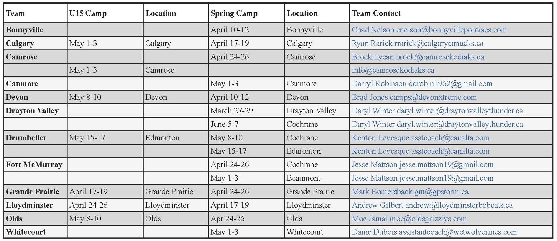 Alberta Junior Hockey League teams will host Spring Camps across the province in 2026. To inquire about an invitation to a camp, or with questions, please contact the specific team representative identified below.