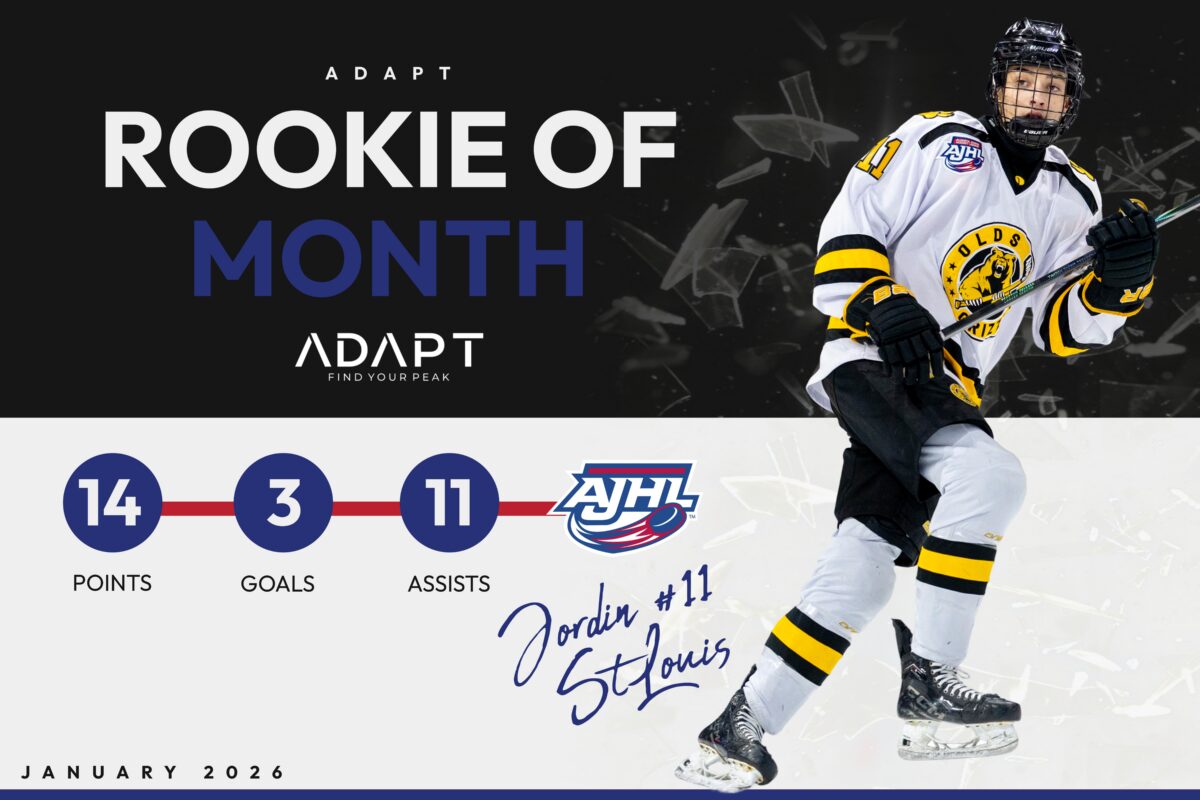 The Adapt AJHL Rookie of the Month is Olds Grizzlys forward Jordin St. Louis after leading all first-year players with 14 points (3G, 11A) in nine games played. The 2009-born Portland Winterhawks draft pick is enjoying a seven-game point streak totaling 12 points.